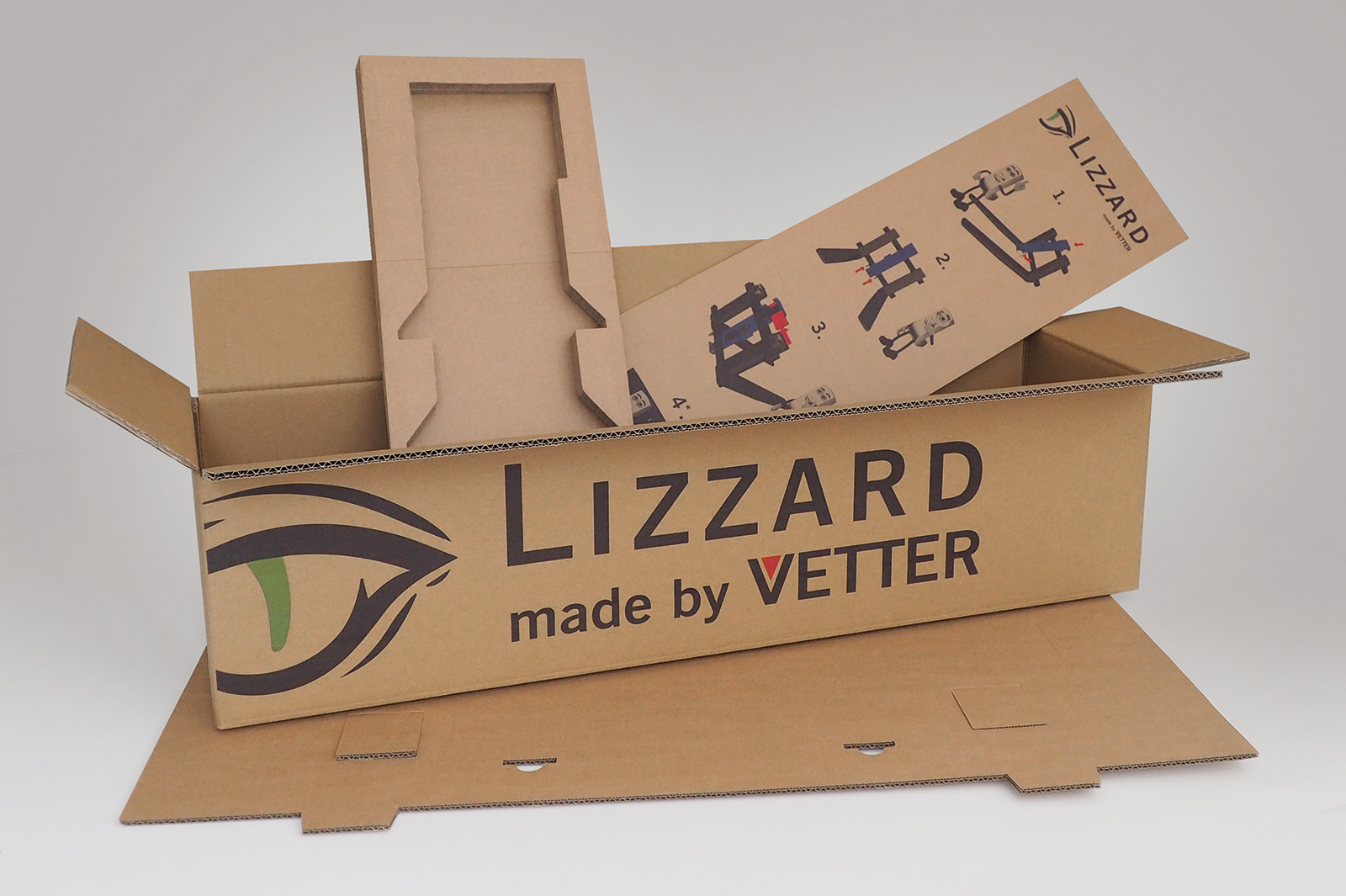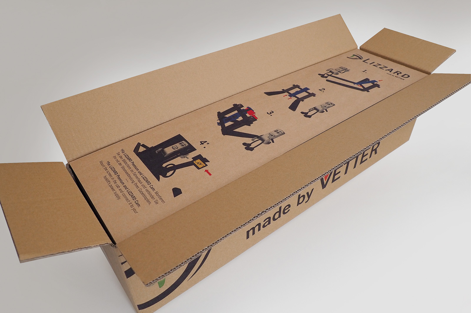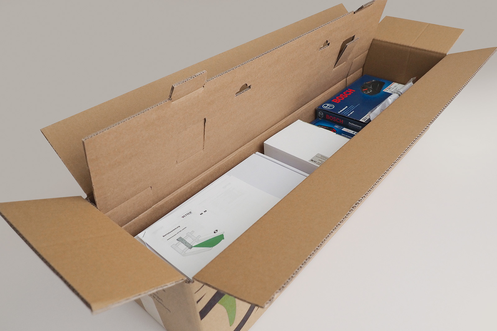 Zum Schluss wird die Montageanleitung eingelegt. Dieser bedruckte Zuschnitt dient beim späteren Öffnen des Kartons als Schnittschutz.