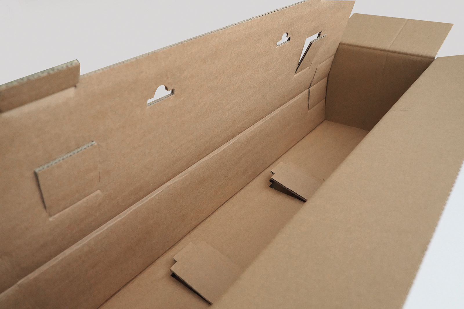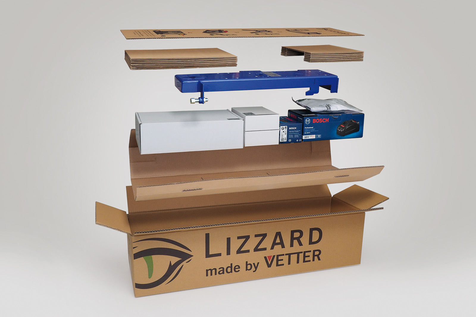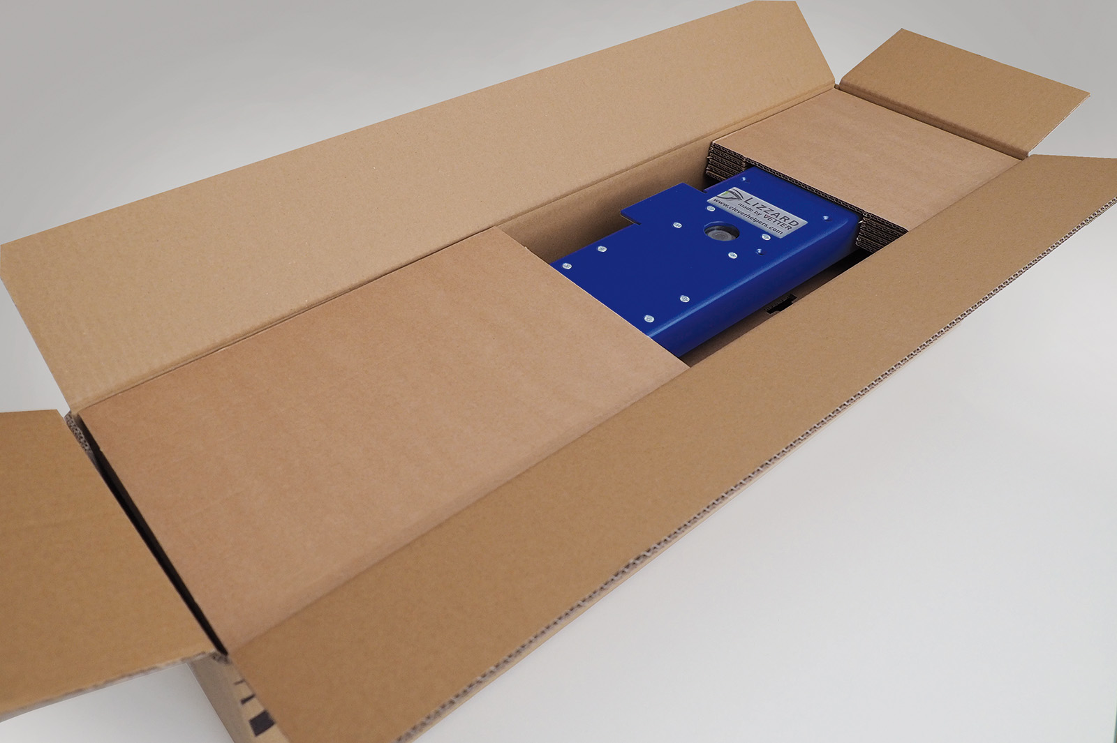 Dieses Verpackungslösung besteht aus einem Wellpapp-Karton, einem Stanzformat für das Zubehör, zwei Formpolsterplatten und einem Zuschnitt, auf dem die Montageanleitung aufgedruckt ist. Zudem dient der Zuschnitt als Schnittschutz, wenn der Karton mit einem Messer geöffnet wird.